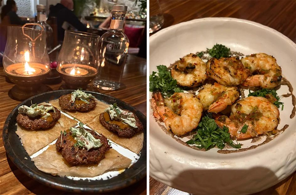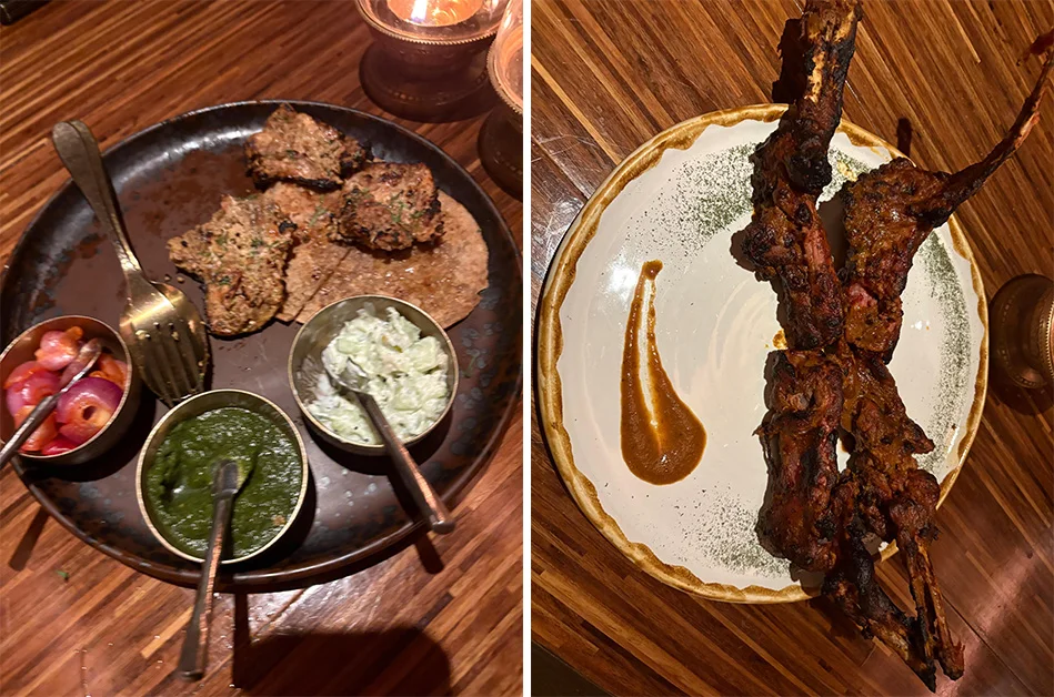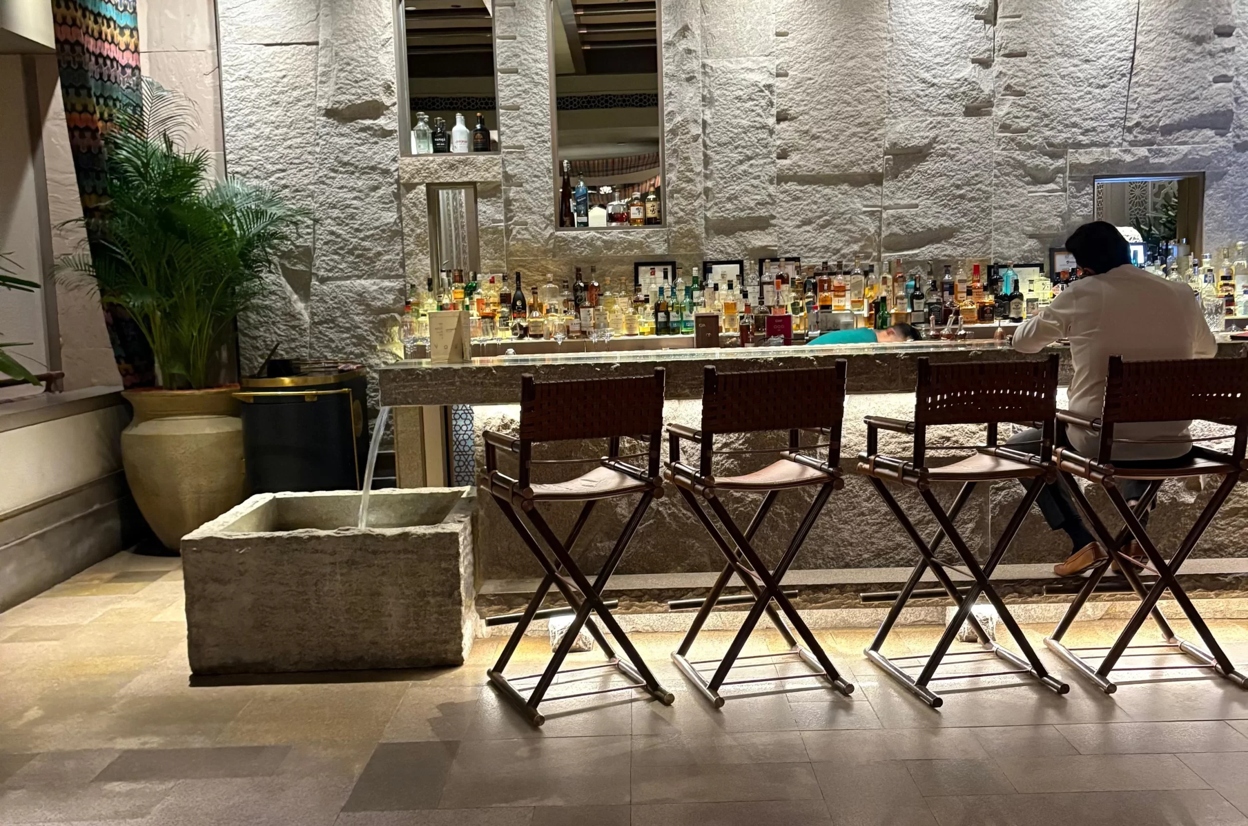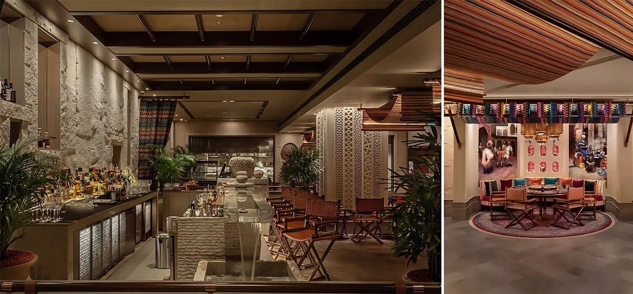 Upon entering, you’re immediately enveloped in a rich and authentic tapestry. The décor marries rusticity with understated luxury: raw stone walls, warm wood textures, burnished copper accents, and low, golden lighting, candle lights on tables all lend a unique intimacy to this fine dining destination. The ambience is alive with movement and sound upbeat regional melodies mingle with the soft murmur of conversations, laughter, and the gentle rush of water from the Bar, whose cascading stream behind a gleaming display of bottles transforms the space into a theatre of elegance.