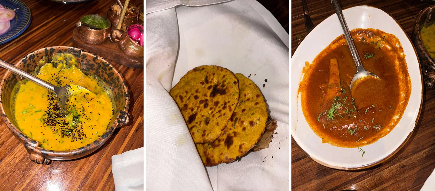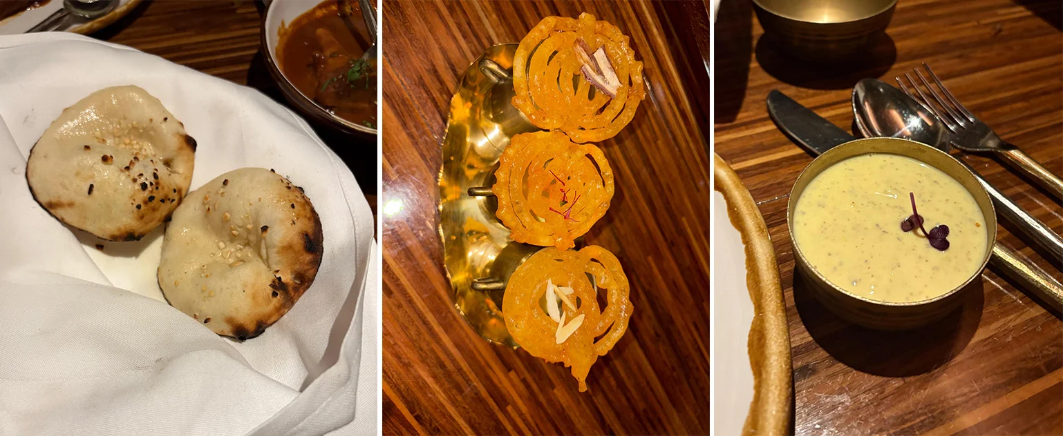 Interspersed throughout the main courses are moments of subtle elegance and palate-cleansing finesse. The Arhar and Moong Dal is creamy, subtly spiced, and perfumed with ghee a soulful interlude that evokes home kitchens across Northern India. The Mustard Ori Raita provides a counterpoint: tangy, herbaceous, and delicately sharp, its mustard seeds cutting through richness without overwhelming the senses. Together, they establish rhythm and balance in the meal, ensuring every bite is layered with intention.