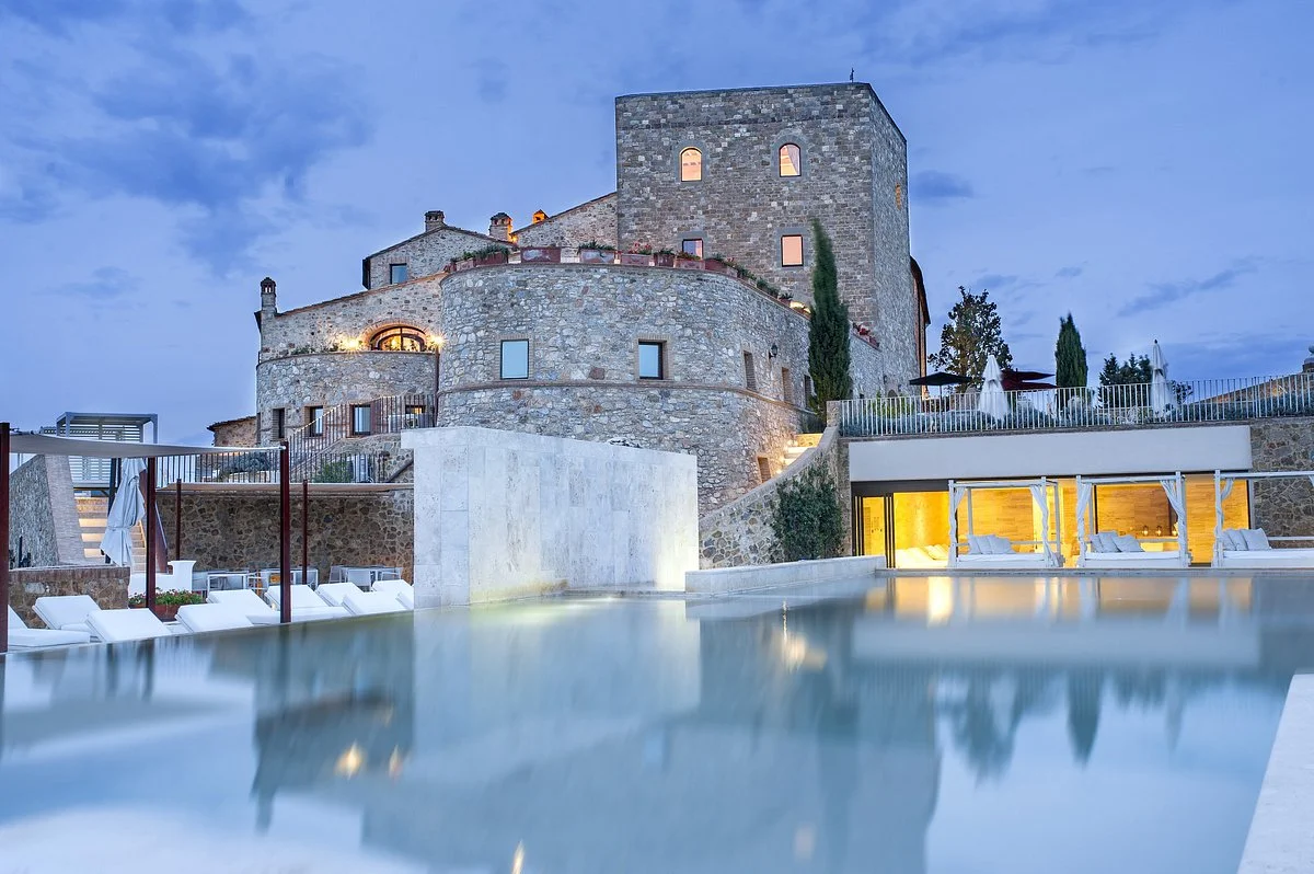 Situated on a gentle hill overlooking Tuscany’s highest mountain peak, Mt Amiata , is this surreal site of recently revamped luxury boutique establishment. Built in the 11th century, this hotel is home to 20 bedrooms and suites with the sumptuous views of the vineyards surrounding the castle. This castle is now severely popular for its outdoor wellness pools, thermal pool, turkish baths and spa. The castle has a mouth watering gourmet restaurant and a panoramic view of the swimming pool. A unique venue for high profile meetings and weddings.